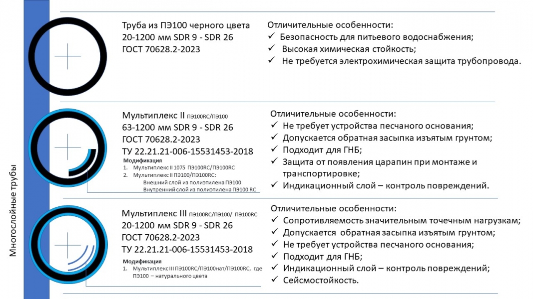 Материал труб: Наружный слой и внутренний слой из ПЭ100, ПЭ 100-RC, средний - из ПЭ 100 натурального цвета