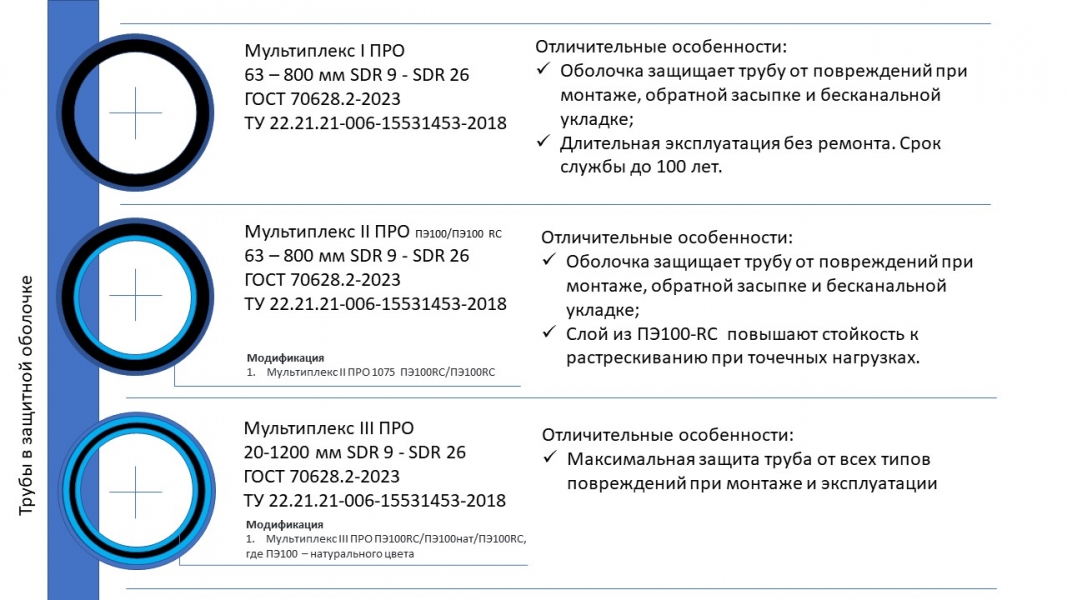 Материал труб: Защитаня оболочка ПРО - минералонаполненный полипропилен. Наружный, внутренний слой – ПЭ100, ПЭ100-RC