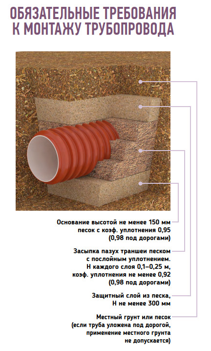 Гофрированные канализационные трубы применяются для устройства систем закрытого типа. Они укладываются в предварительно выкопанные траншеи, глубина которых превышает уровень промерзания земли зимой. Эффективность отвода вод